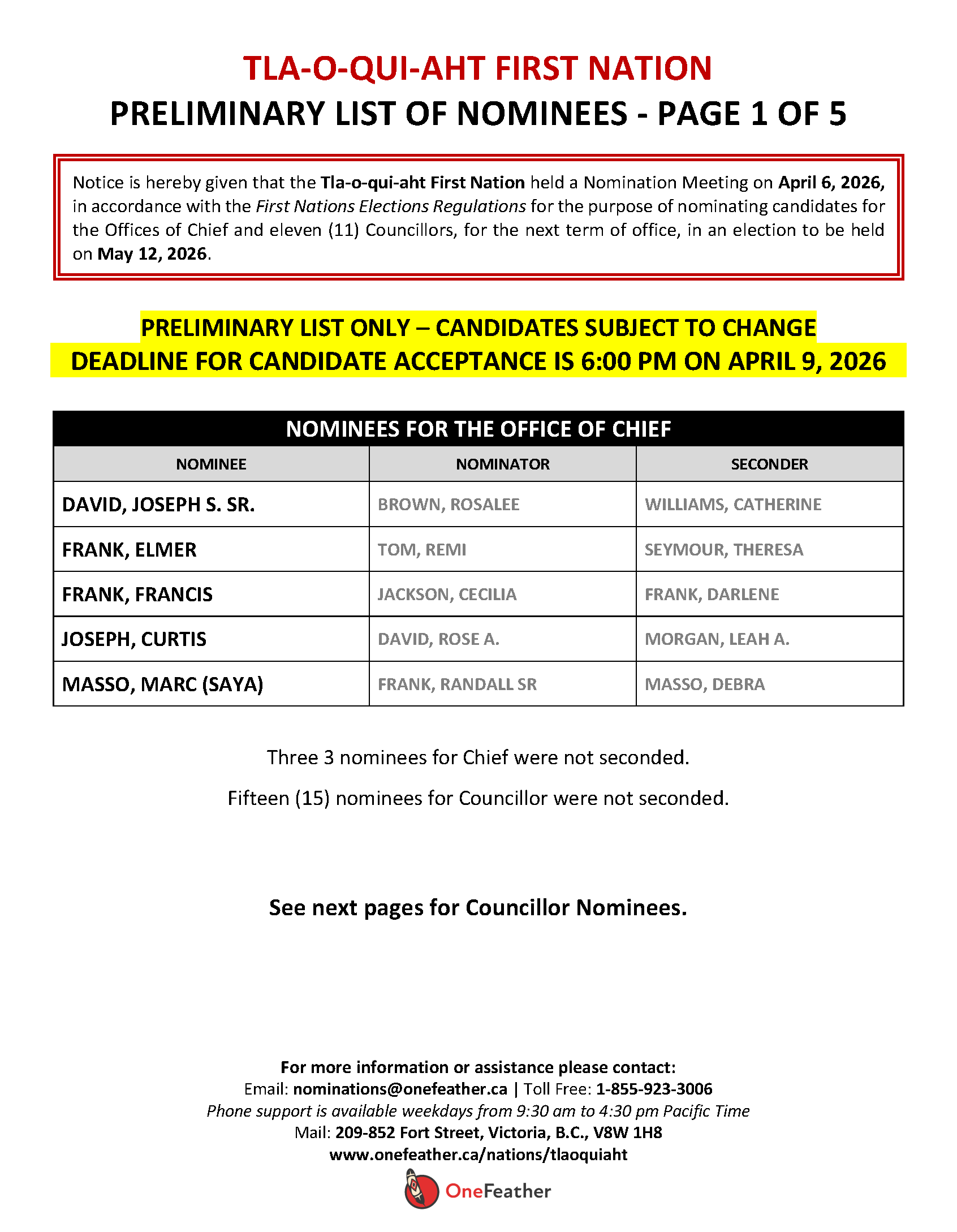 The Tla-o-qui-aht First Nation and Administration is located on the West Coast of Vancouver Island, in Tofino, British Columbia. The Tla-o-qui-aht Nation and its people, are a nation with over 1200 Members. The Administration is comprised of over 100 employees that continues to grow as the Tla-o-qui-aht Nation’s Lands, Economic, and local growth continues. As a traditionally strong nation, our teachings continue to honour our traditional Governance of our Ha’wiih (Hereditary Chiefs), and in doing so we provide service to our members to care, and promote our traditional values.