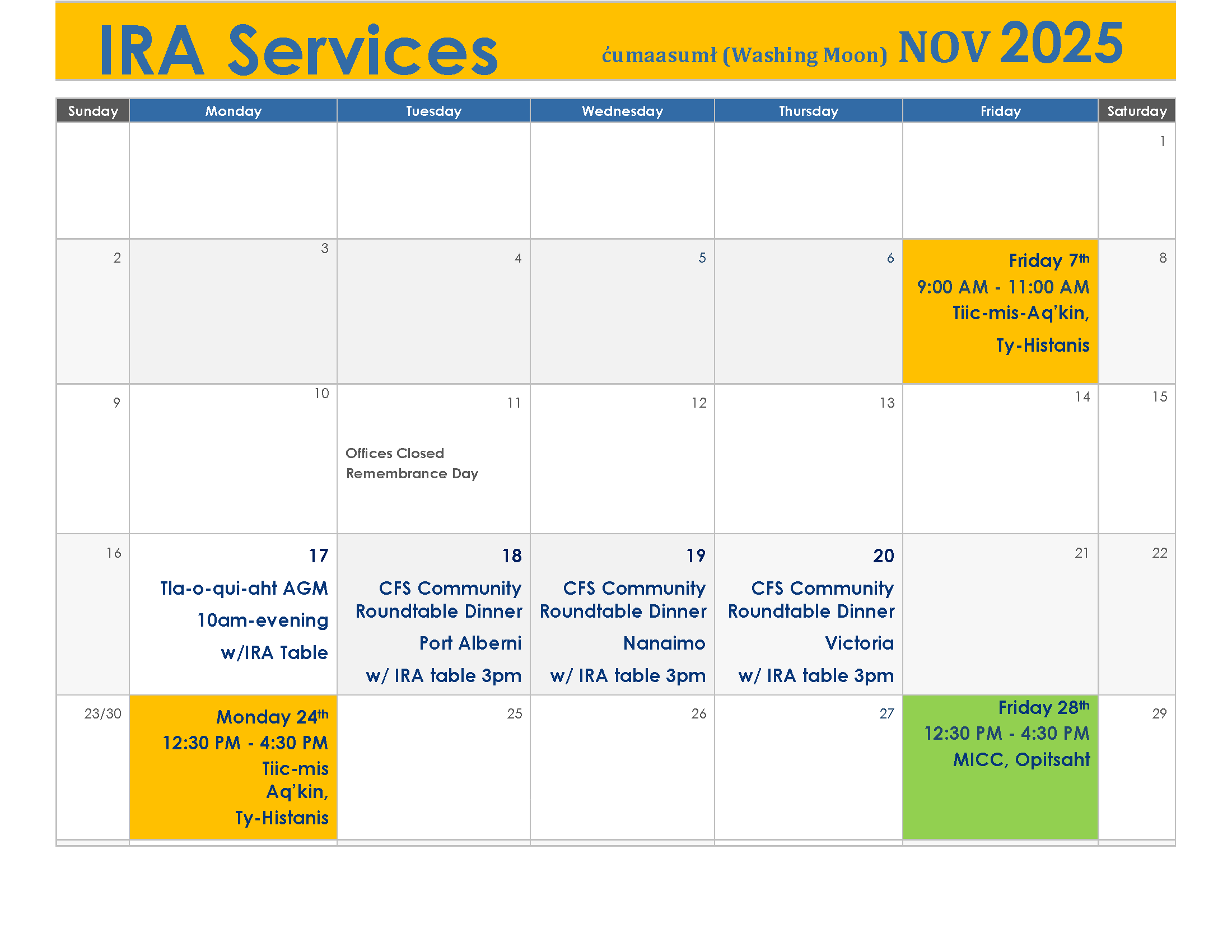 Tla-o-qui-aht Registry (Membership Department) is responsible for maintaining the registry listing of all Tla-o-qui-aht members. One employee manages and operates this very important function of the Nation, the IRA Clerk (Indian Registry Administrator).