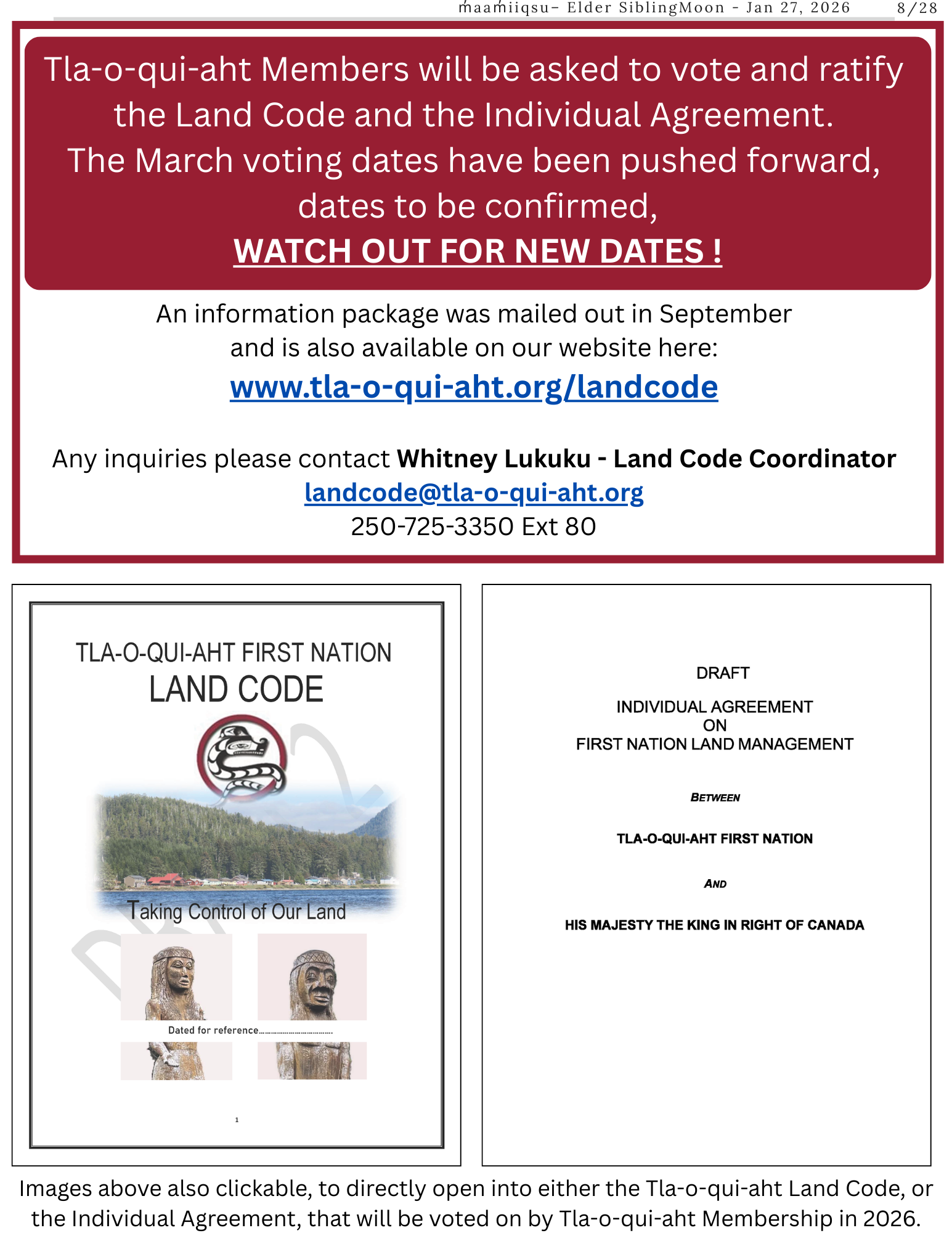 Whitney Lukuku, Land Code Coordinator, has been brought on board to assist the Nation to write a Land Code. Please read the attached introduction to what a Land Code is and what it is not. Whitney will appreciate any help from the community as to what Tla-o-qui-aht would like to be addressed in the final Land Code document.