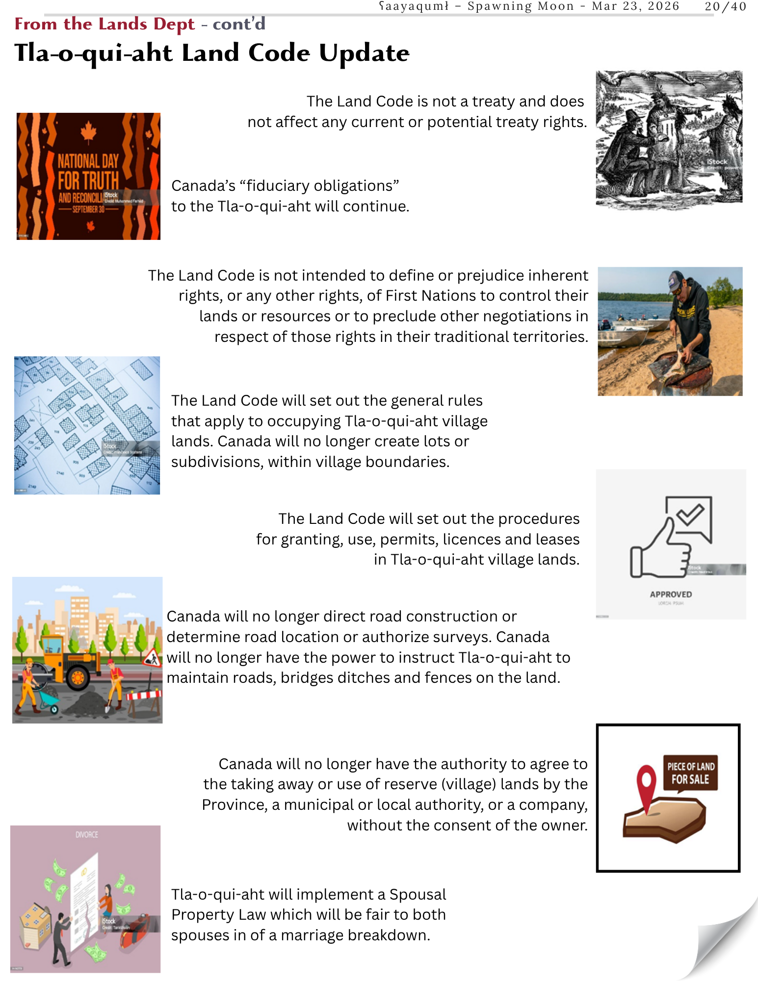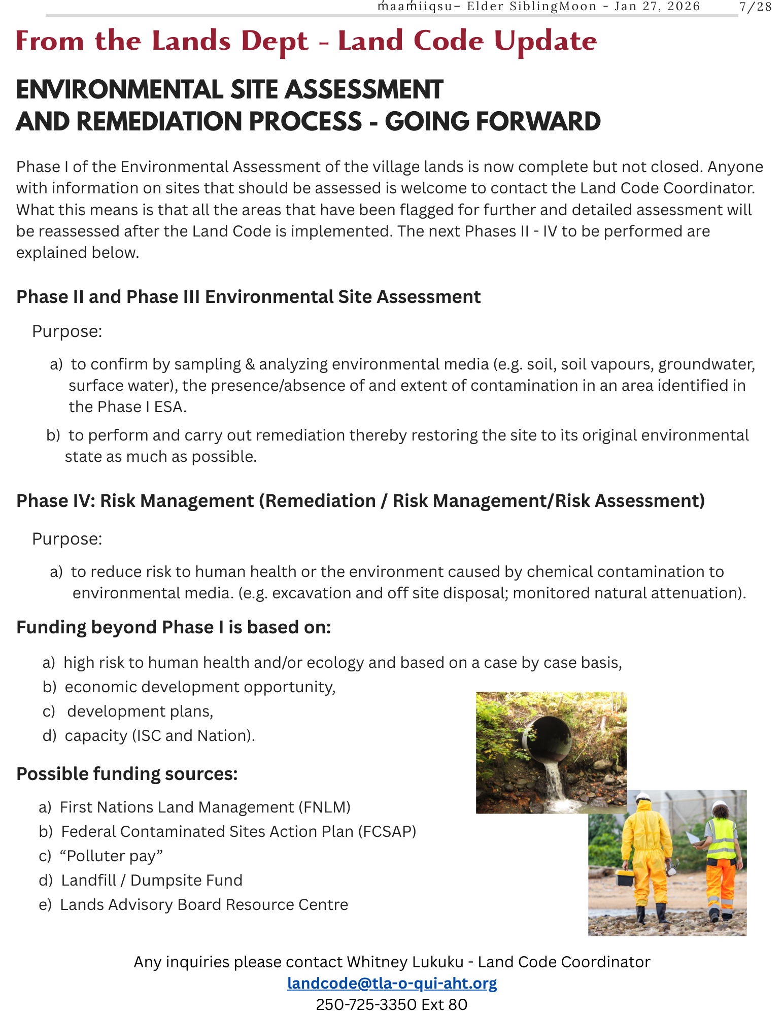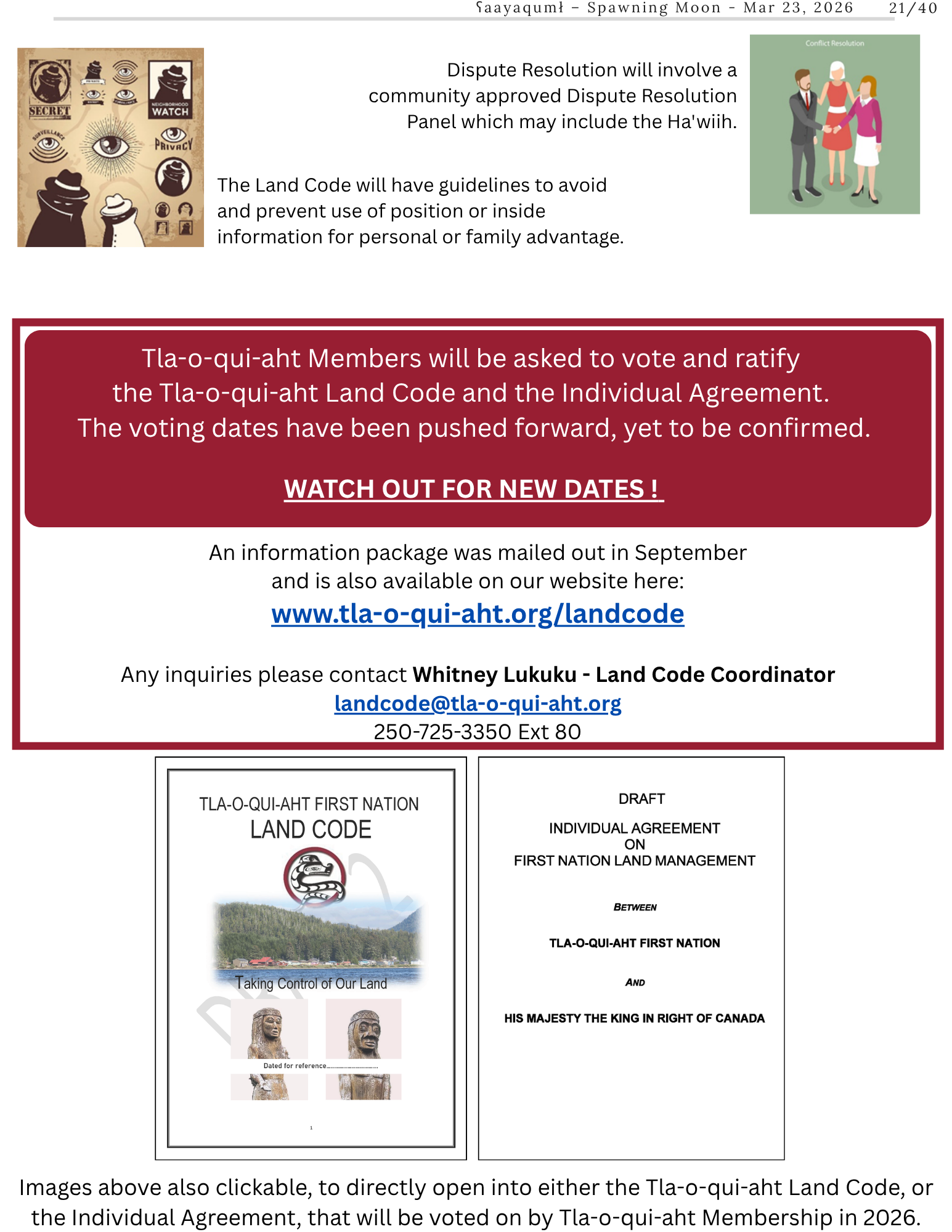 The Land Code will be approved by a community vote within two years. Therefore, it is advantageous for members to understand what it is all about before the vote. Whitney is located in the Economic Development Office. Please come and see Whitney for more information or clarifications if you would like, or email landcode@tla-o-qui-aht.org