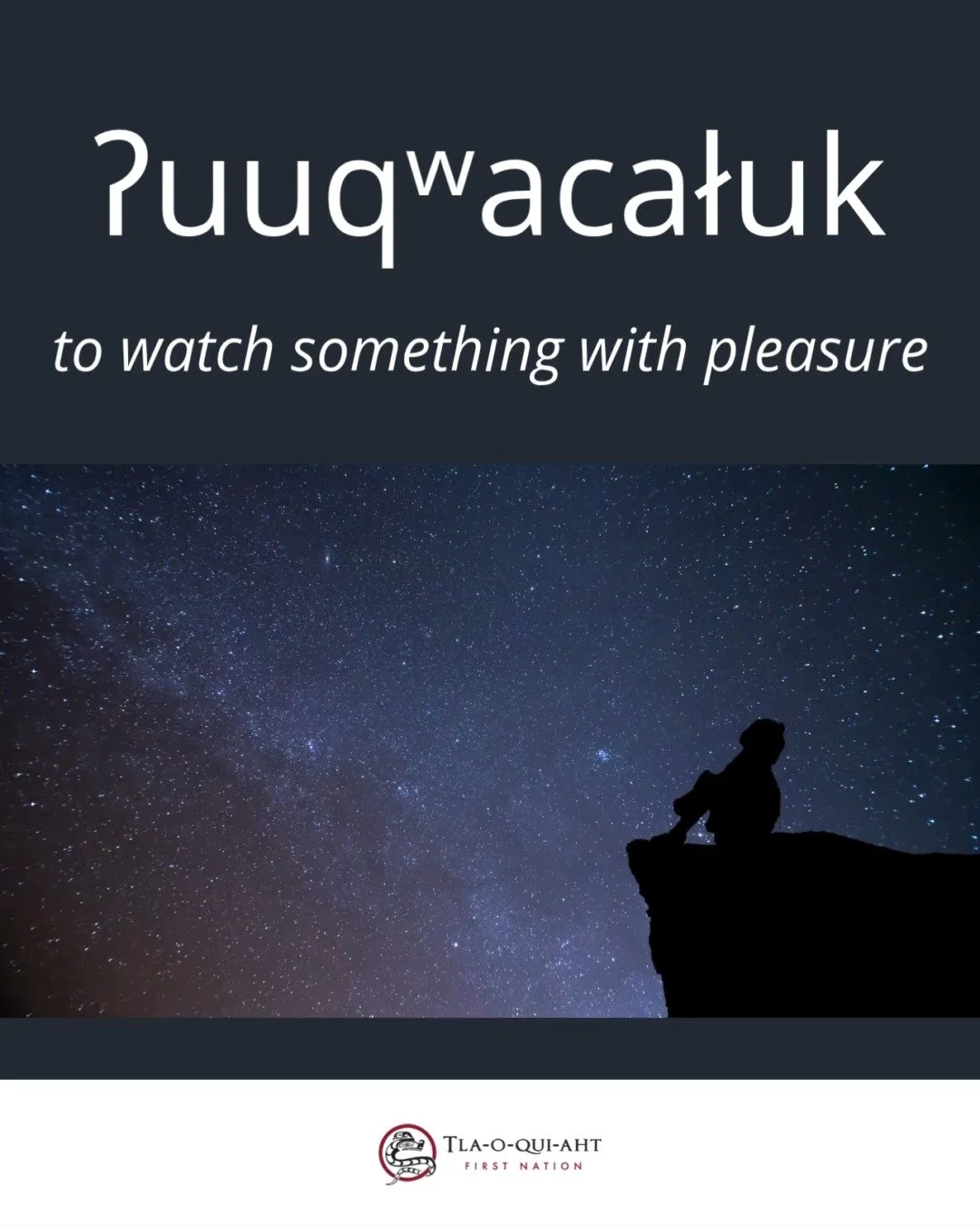 Meaning “all along the mountains and sea,” the Nuu-chah-nulth language is spoken by 14 Nuu-chah-nulth First Nations made up of 10,000 members in three regions on Vancouver Island’s West Coast. ƛaʔuukʷiʔatḥ speak the central dialect of the Nuu-chah-nulth language.