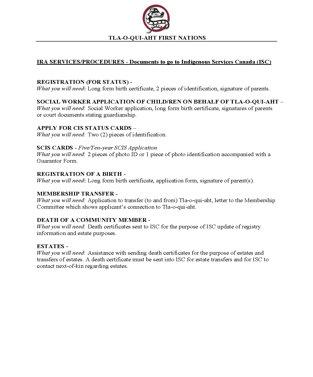Tla-o-qui-aht First Nations January 20, 2025 IRA Services and Procedures - January 2025 Tla-o-qui-aht First Nations January 20, 2025 re: Documents to go to ISC