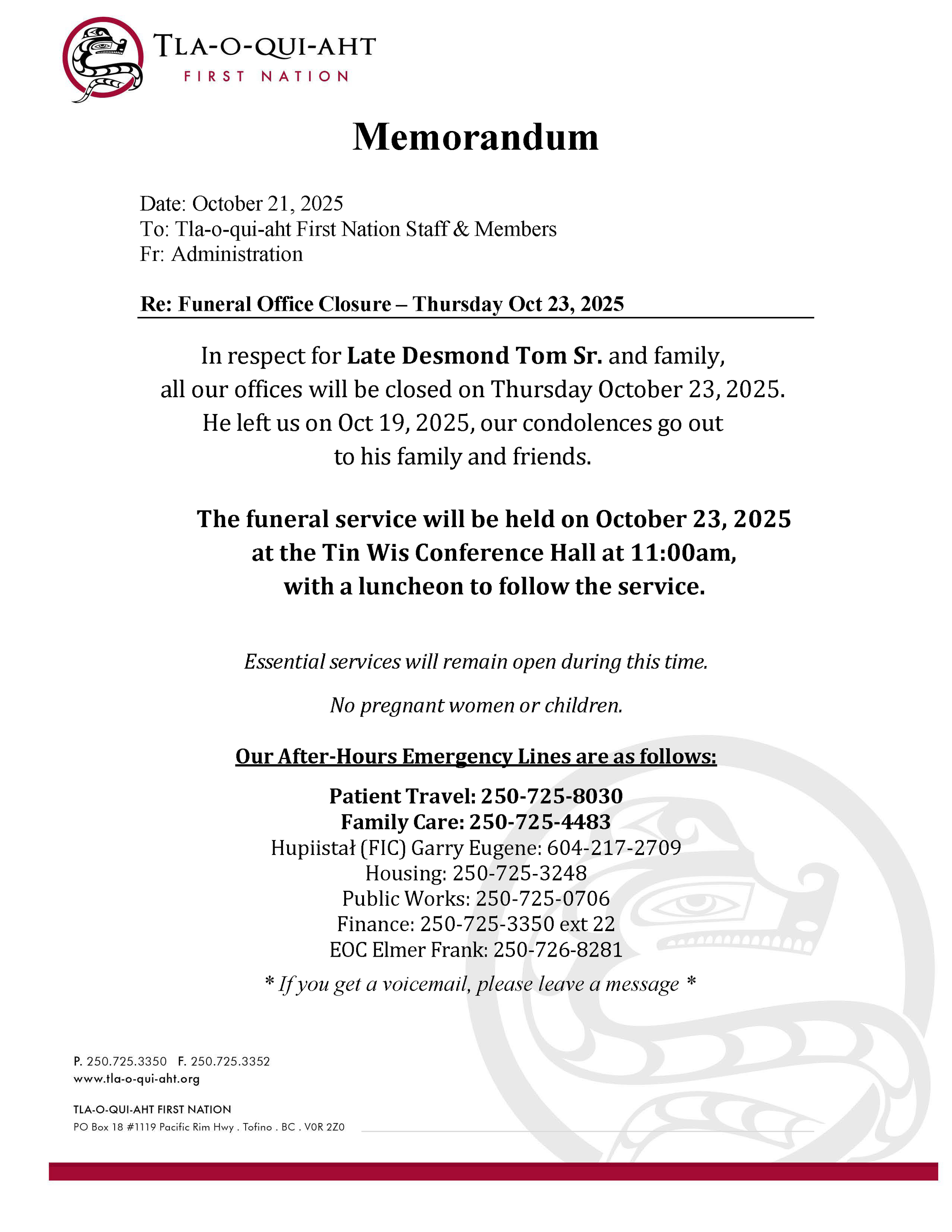 Tla-o-qui-aht First Nations October 21, 2025 Funeral Office Closure Oct 23, 2025 Tla-o-qui-aht First Nations October 21, 2025