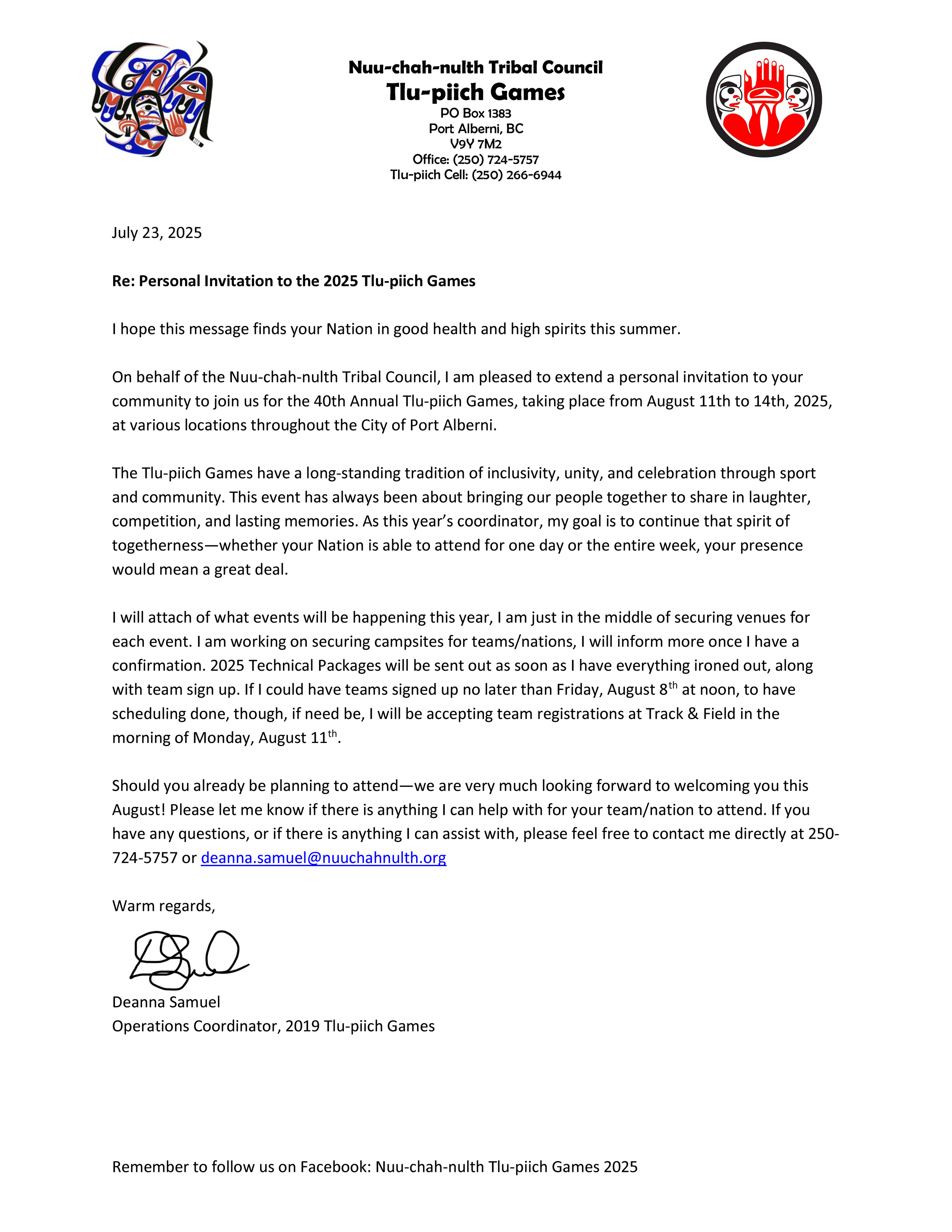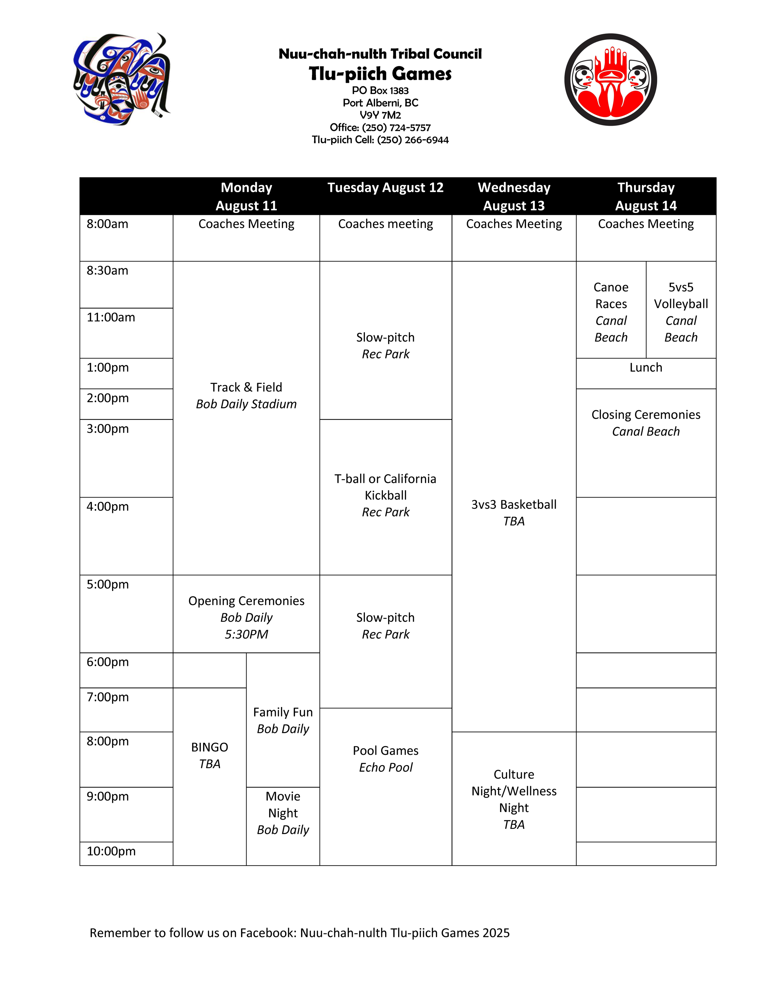 Tla-o-qui-aht First Nations July 25, 2025 Tlu-piich Games Invitation and Schedule Tla-o-qui-aht First Nations July 25, 2025