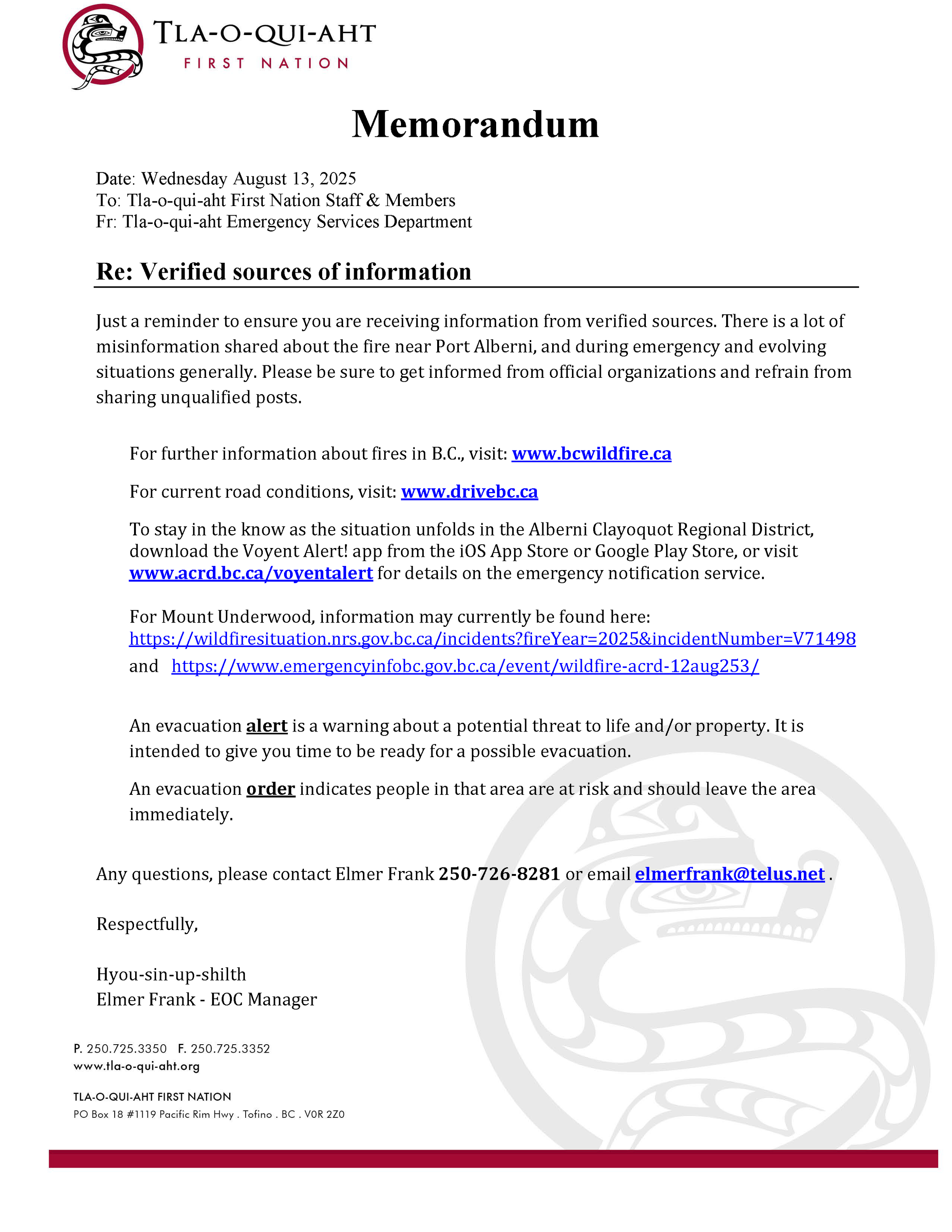 Tla-o-qui-aht First Nations August 13, 2025 EOC Memo - Verified sources of information Tla-o-qui-aht First Nations August 13, 2025