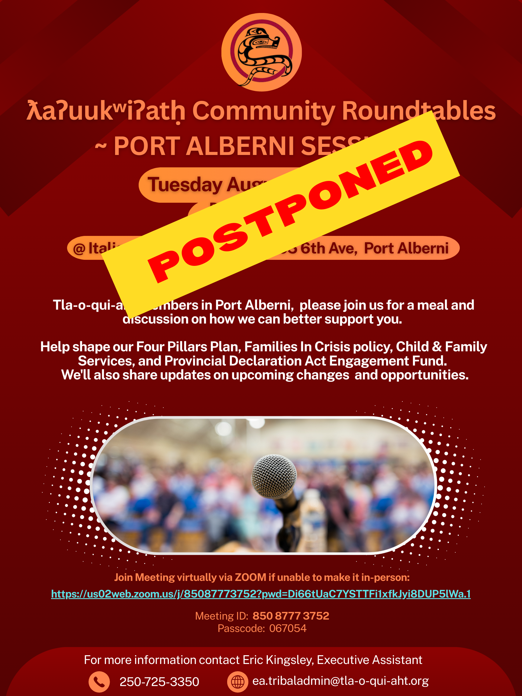 Tla-o-qui-aht First Nations August 13, 2025 POSTPONED - Port Alberni Session - Community Roundtables Tla-o-qui-aht First Nations August 13, 2025