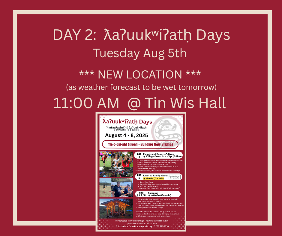 Tla-o-qui-aht First Nations August 4, 2025 ƛaʔuukʷiʔatḥ Days updates - Movie Night Monday & Tuesday Location @ Tin Wis Tla-o-qui-aht First Nations August 4, 2025