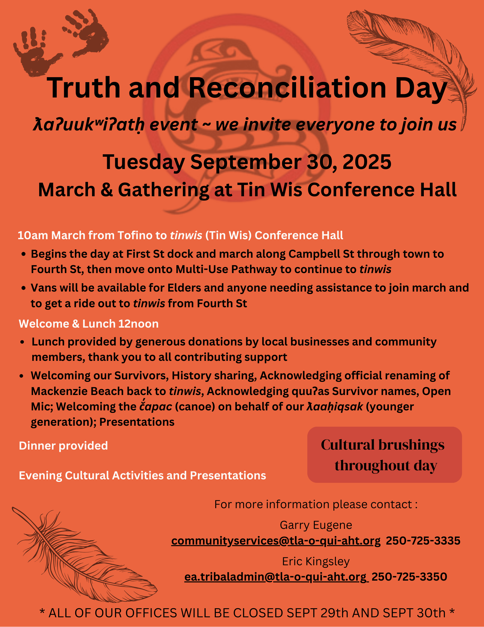 Tla-o-qui-aht First Nations September 24, 2025 Truth and Reconciliation Day ƛaʔuukʷiʔatḥ event ~ we invite everyone to join us Tla-o-qui-aht First Nations September 24, 2025 Tuesday September 30, 2025 - March & Gathering at Tin Wis Conference Hall