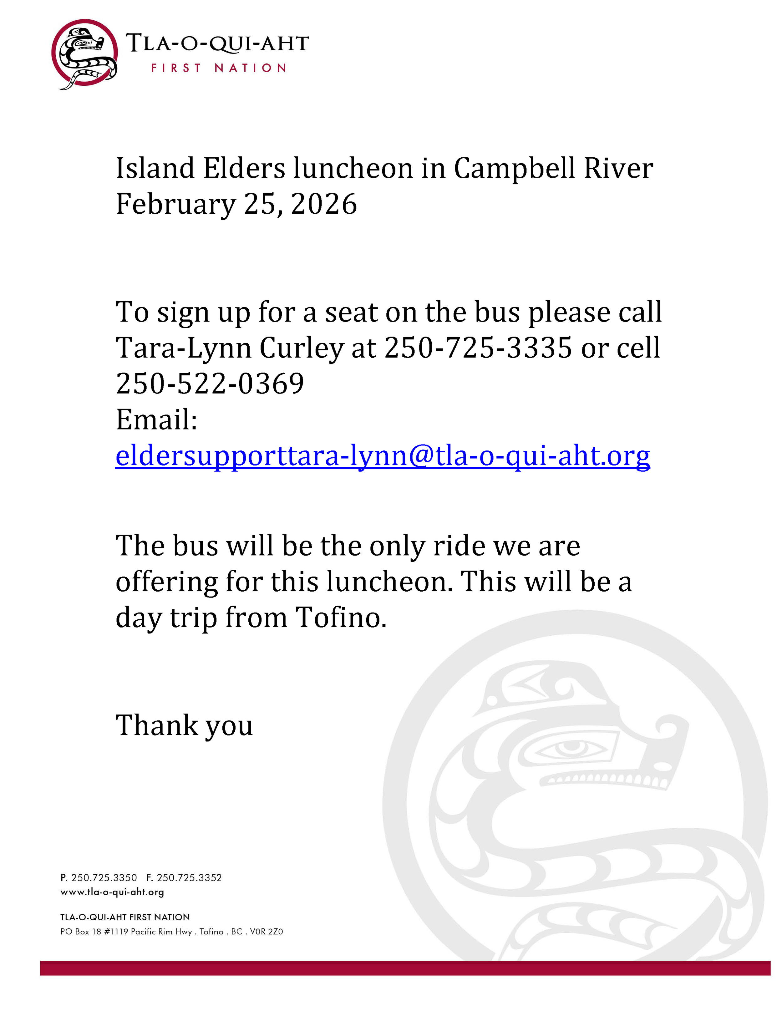Tla-o-qui-aht First Nations February 9, 2026 Elders Luncheon - Campbell River - Feb 25, 2026 Tla-o-qui-aht First Nations February 9, 2026