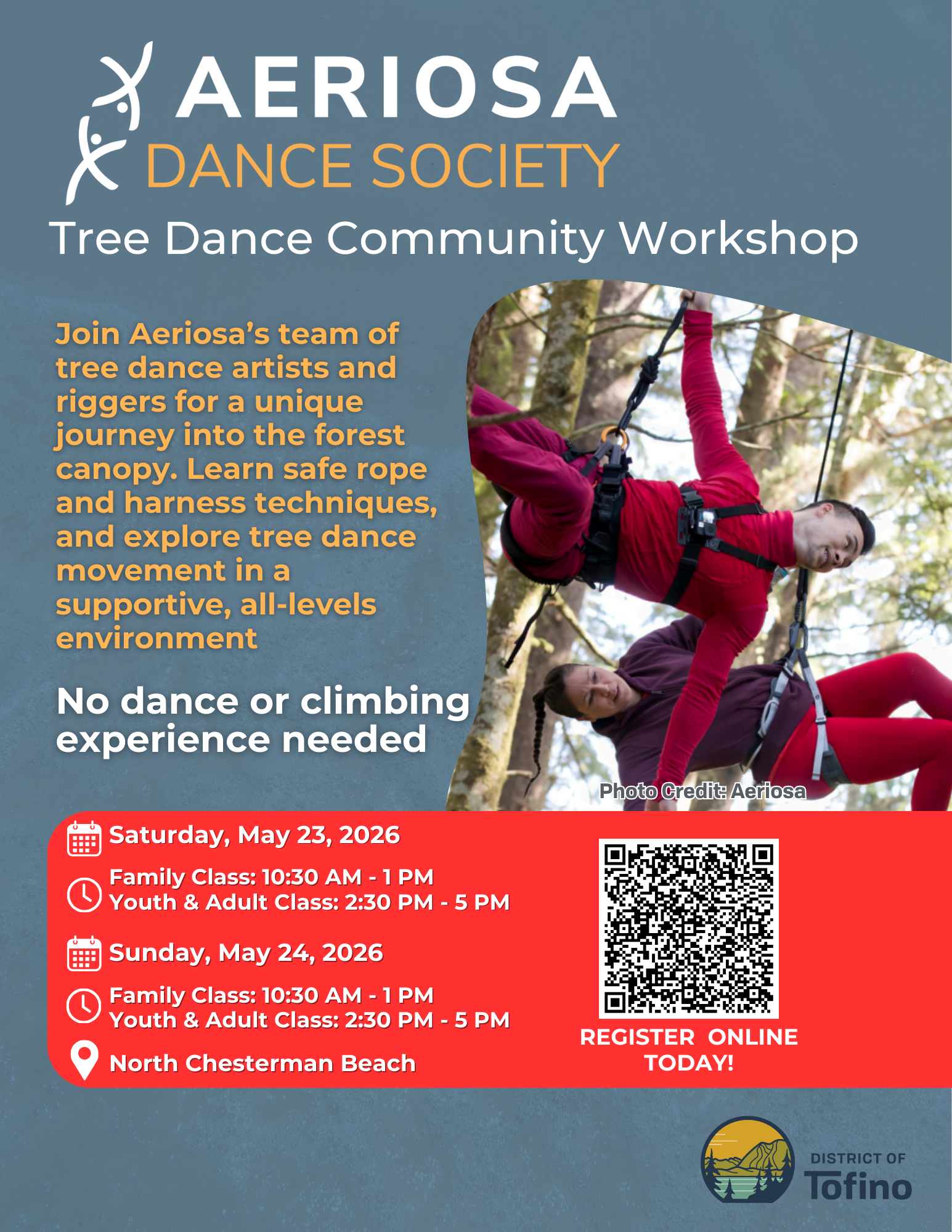Aeriosa Dance Society would like to invite TFN youth and families to try out treetop dancing at North Chesterman Beach. Transportation from TFN communities is going to be arranged so that this will not be an additional cost. Participants can decide how high into the canopy they'd like to go and which tricks they'd like to try, so it's fun for any level of bravery and requires no skills or experience.