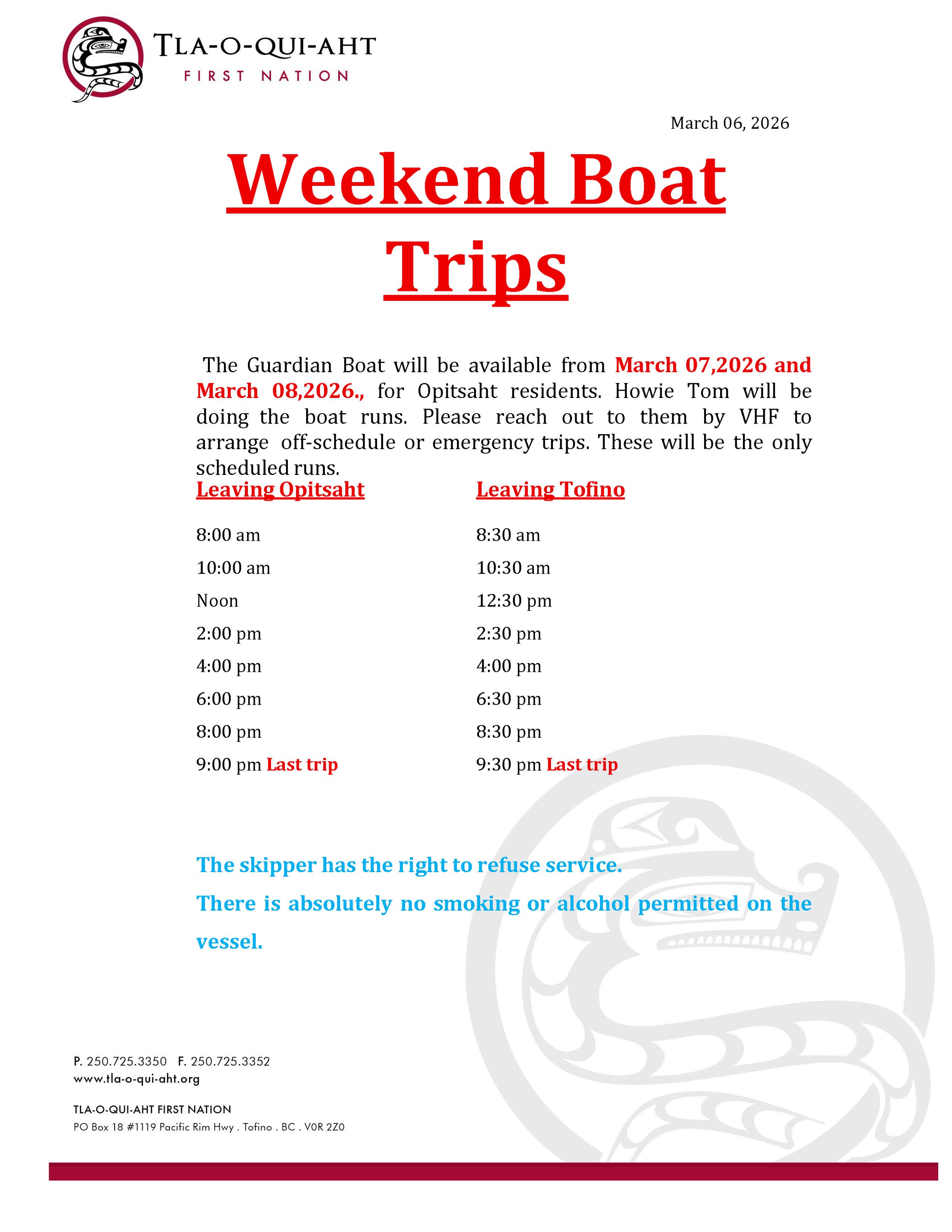 Tla-o-qui-aht First Nations March 6, 2026 Weekend Boat Schedule Mar 7 & 8, 2026 - Guardian Tla-o-qui-aht First Nations March 6, 2026