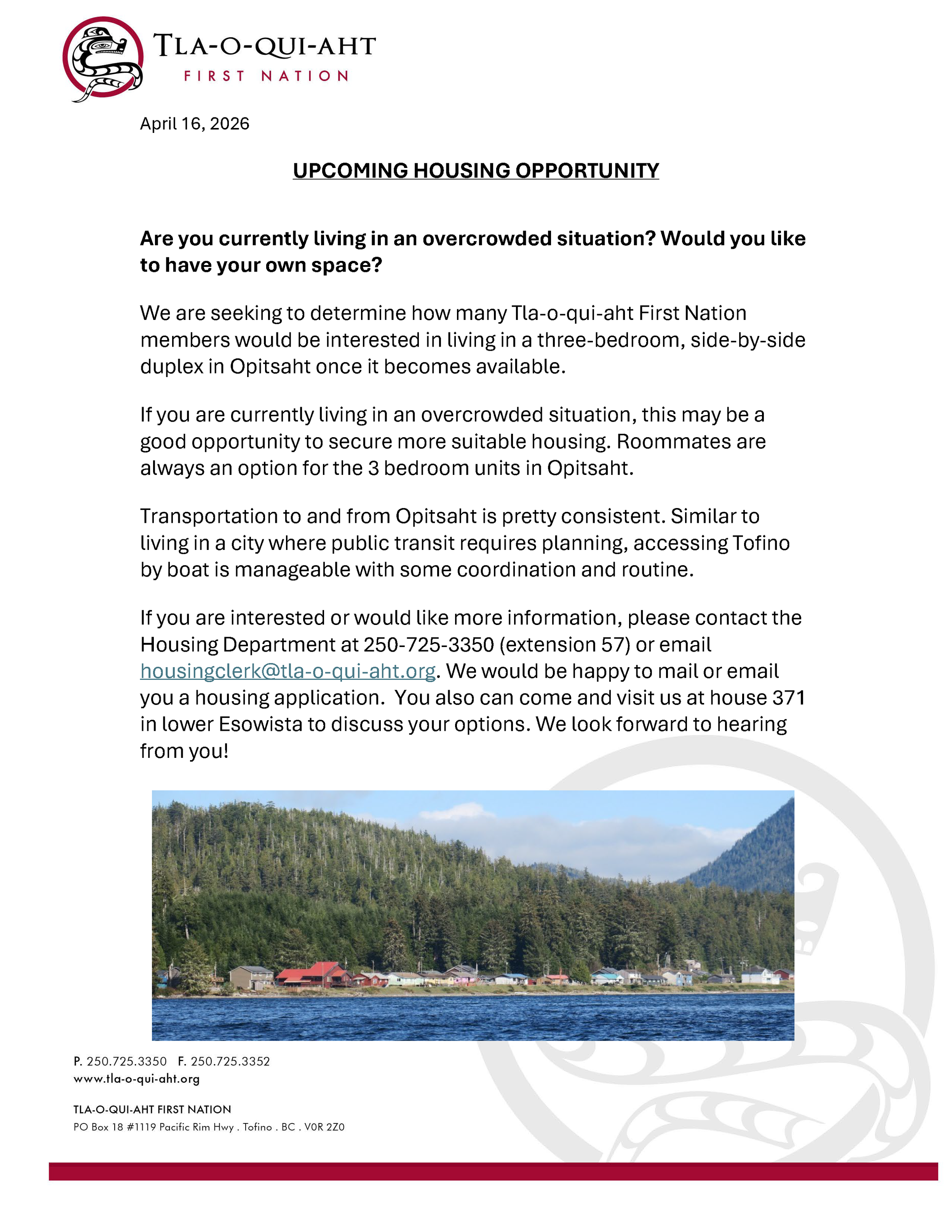 Tla-o-qui-aht First Nations April 16, 2026 Upcoming Housing Opportunity - Opitsaht Tla-o-qui-aht First Nations April 16, 2026