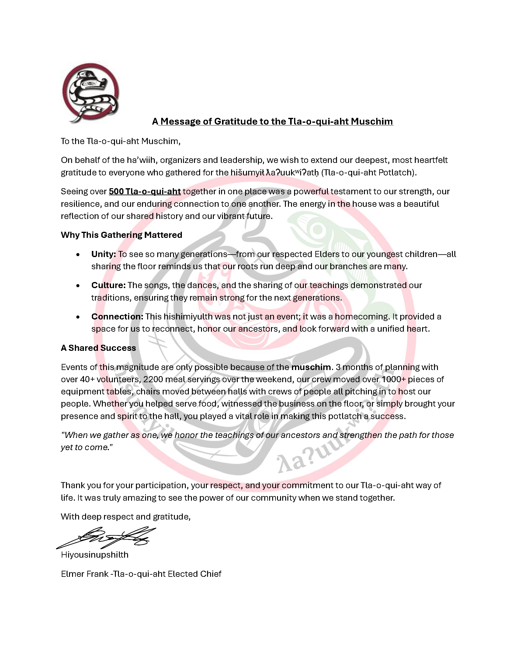Tla-o-qui-aht First Nations April 21, 2026 A Message of Gratitude to the Tla-o-qui-aht Muschim Tla-o-qui-aht First Nations April 21, 2026