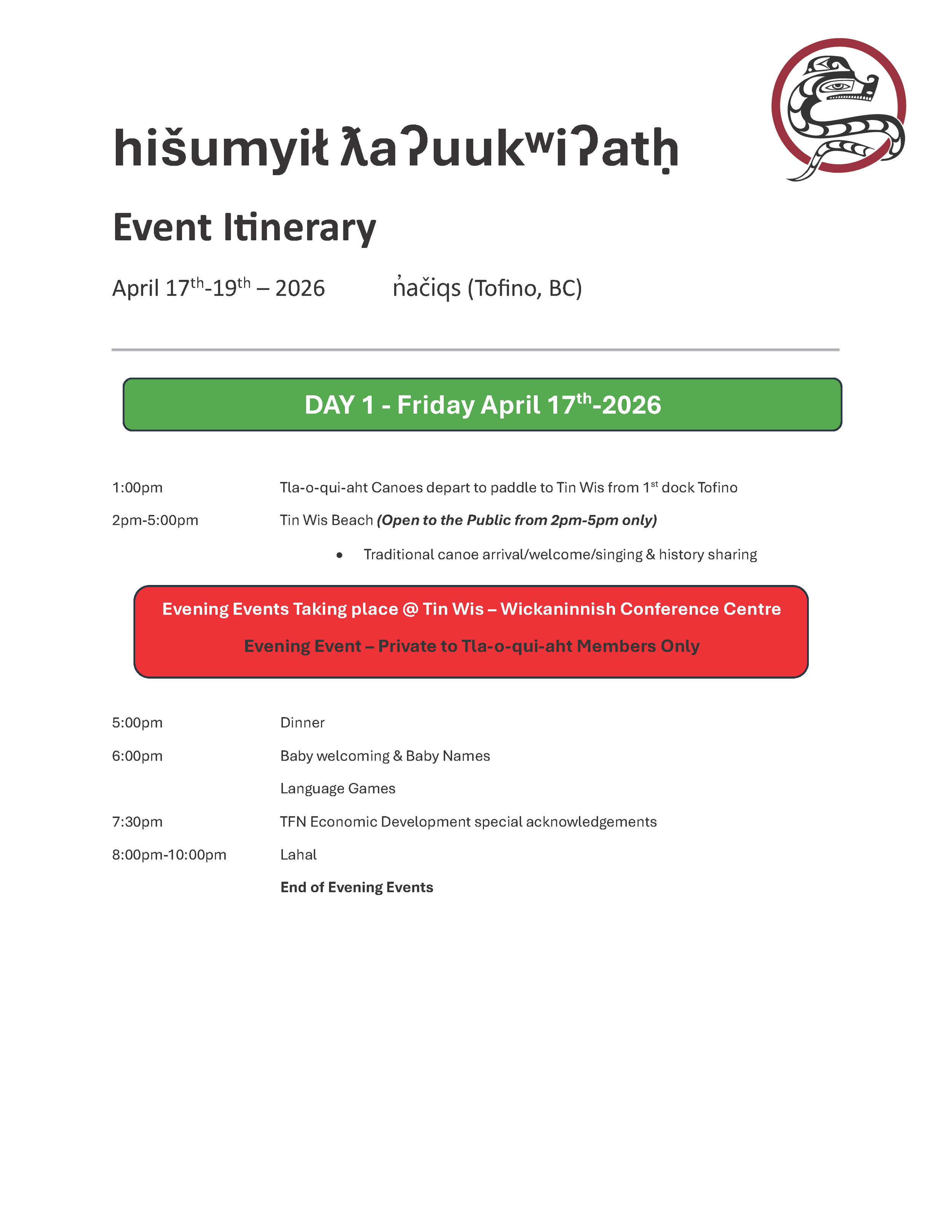 Tla-o-qui-aht First Nations April 9, 2026 hišumyił ƛaʔuukʷiʔatḥ Event Itinerary April 17th-19th, 2026 Tla-o-qui-aht First Nations April 9, 2026